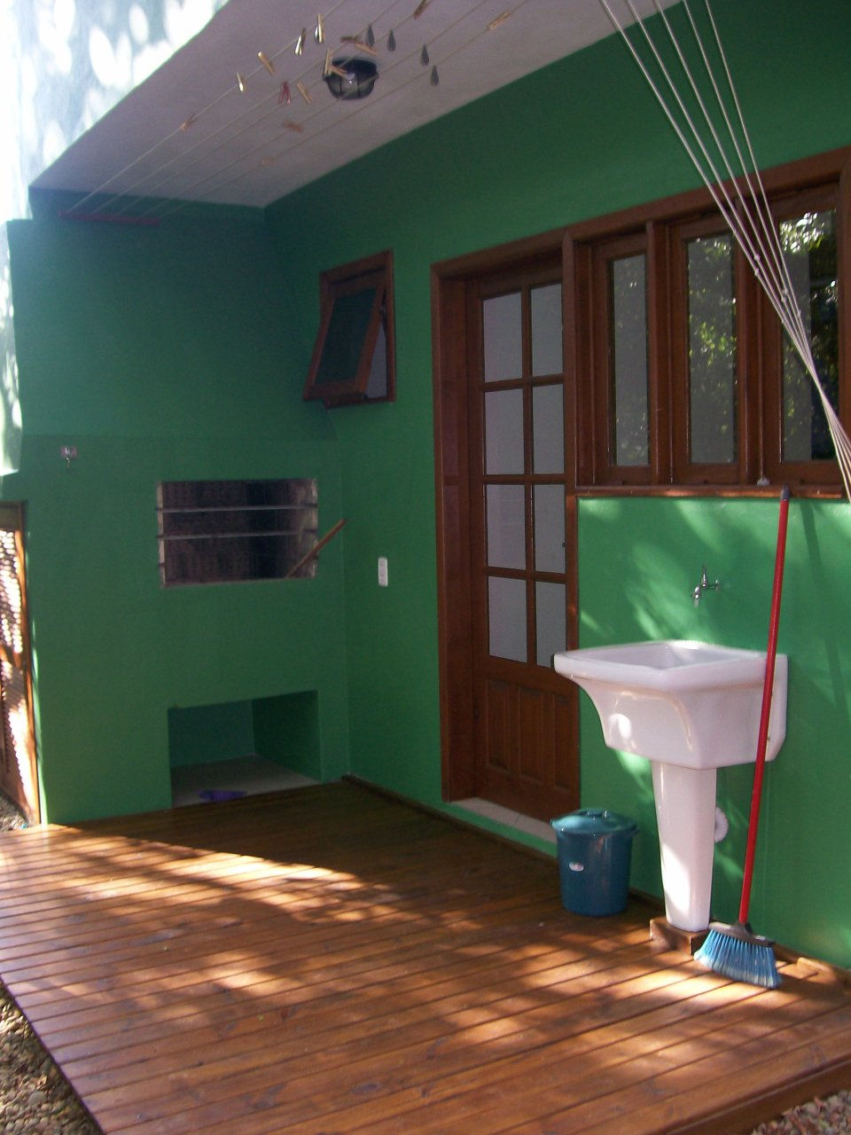 No térreo, outro banheiro igual, e ambiente com sala e cozinha integrados, televisor com antena parabólica, lareira, ventilador de teto, fogão, micro-ondas, geladeira duplex, louças, panelas, talheres, espetos, pano de prato, etc. E aos fundos área com tanque, varal e churrasqueira privativa.
